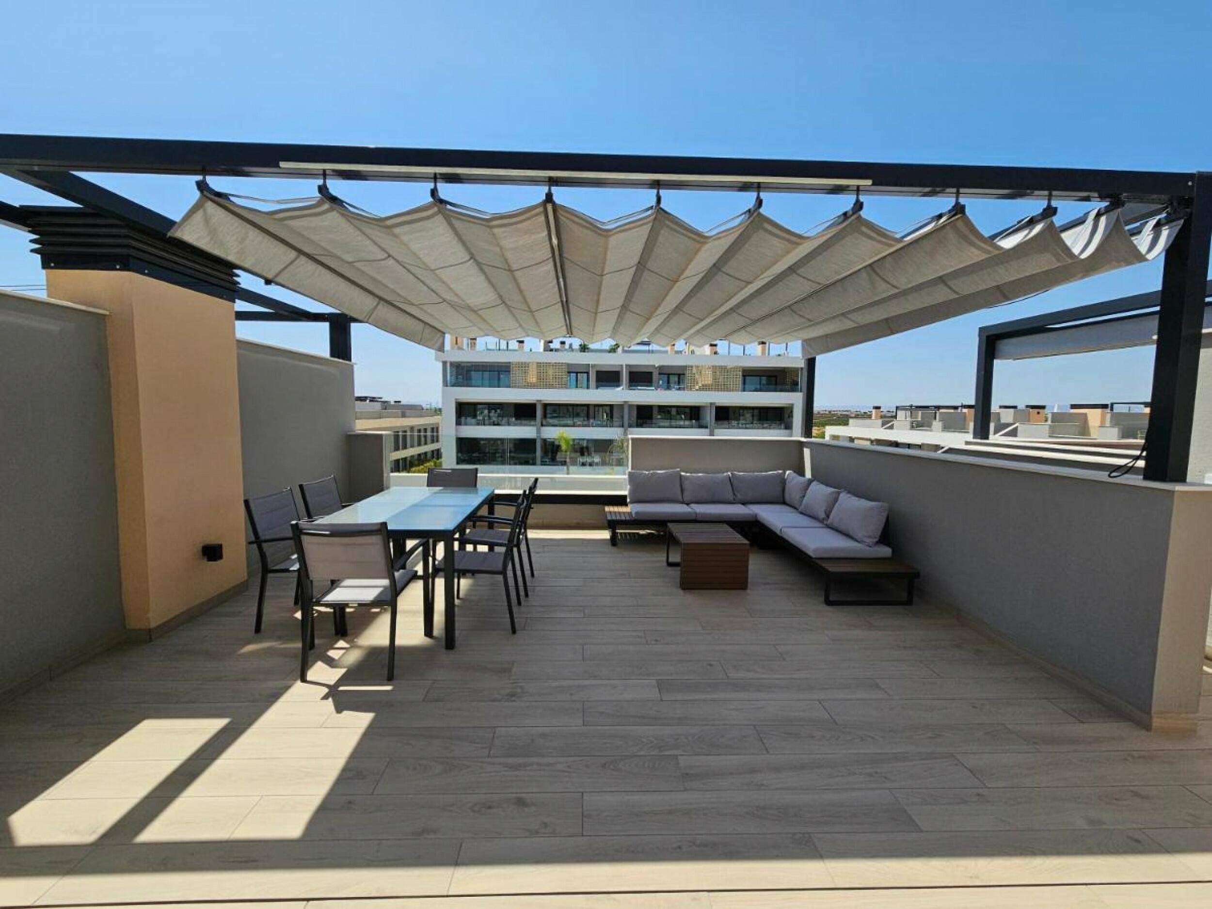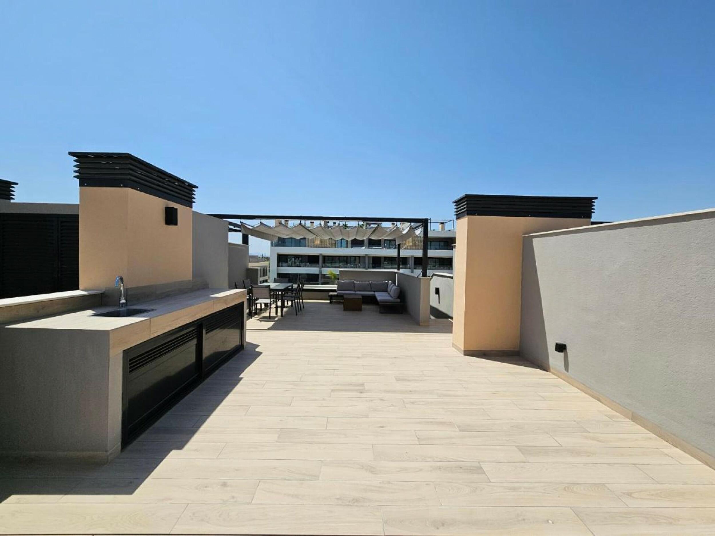 Beautiful resale penthouse apartment in four storey block in Santa Rosalia Lake and Life Resort. The development has communal areas with a swimming pool and green areas. The apartment has an open plan lounge/dining/kitchen area with large glass doors leading out to the sun terrace, master bedroom with en-suite, double bedroom and a shower room. Stairs from the terrace lead up to the large rooftop solarium. Sold fully furnished. This property is ideal for renting out immediately.Features: Parking and Storage Area included, Communal swimming pool with saline chlorination system, Underfloor electrical heating in bathrooms, Porcelain floor tiles, Duct air conditioning (hot and cold air), High energy-efficient heat pump system for sanitary hot water (Aerothermia), Underfloor electrical heating in bathrooms, Floor standing lavatories with built-in cisterns, Suspended cabinets in each bathroom, Built-in kitchen appliances: ceramic hob and extractor fan included. Electric blinds in bedrooms, Pre-installation for electric vehicle charging point.