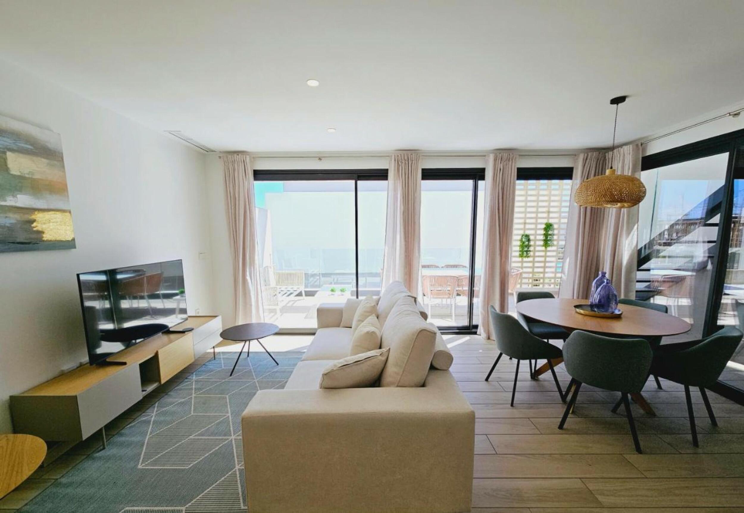 Beautiful resale penthouse apartment in four storey block in Santa Rosalia Lake and Life Resort. The development has communal areas with a swimming pool and green areas. The apartment has an open plan lounge/dining/kitchen area with large glass doors leading out to the sun terrace, master bedroom with en-suite, double bedroom and a shower room. Stairs from the terrace lead up to the large rooftop solarium. Sold fully furnished. This property is ideal for renting out immediately.Features: Parking and Storage Area included, Communal swimming pool with saline chlorination system, Underfloor electrical heating in bathrooms, Porcelain floor tiles, Duct air conditioning (hot and cold air), High energy-efficient heat pump system for sanitary hot water (Aerothermia), Underfloor electrical heating in bathrooms, Floor standing lavatories with built-in cisterns, Suspended cabinets in each bathroom, Built-in kitchen appliances: ceramic hob and extractor fan included. Electric blinds in bedrooms, Pre-installation for electric vehicle charging point.
